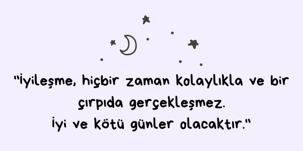 Ve son olarak: İyileşmeleri ya da toparlanmaları konusunda kendi beklentilerinizi bir kenara bırakın. İyileşme, hiçbir zaman kolaylıkla ve bir çırpıda gerçekleşmez. İyi ve kötü günler olacaktır. Sorumluluğunu aldığınız şey; onu iyileştirmek değil, bu inişli çıkışlı süreçte ona eşlik edecek bir sevdiği olmak.